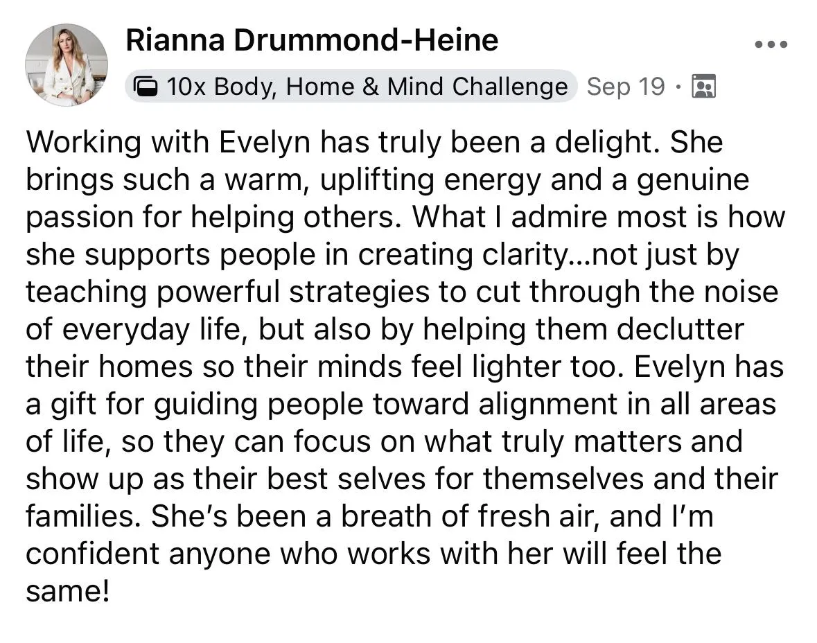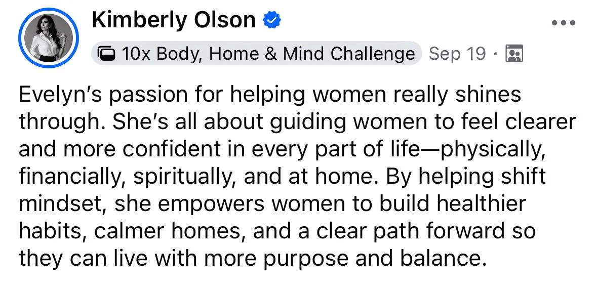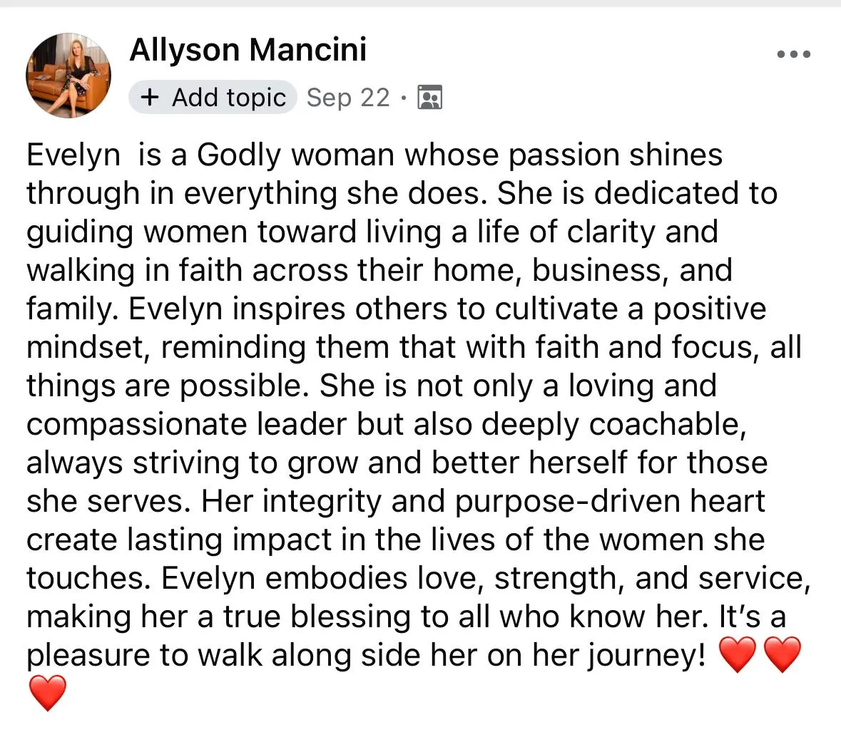 With over a decade of experience in wellness, home detox, direct sales, and network marketing, Evelyn empowers high-performing women to simplify their routines, heal from burnout, and create impact through aligned, spirit-led businesses.